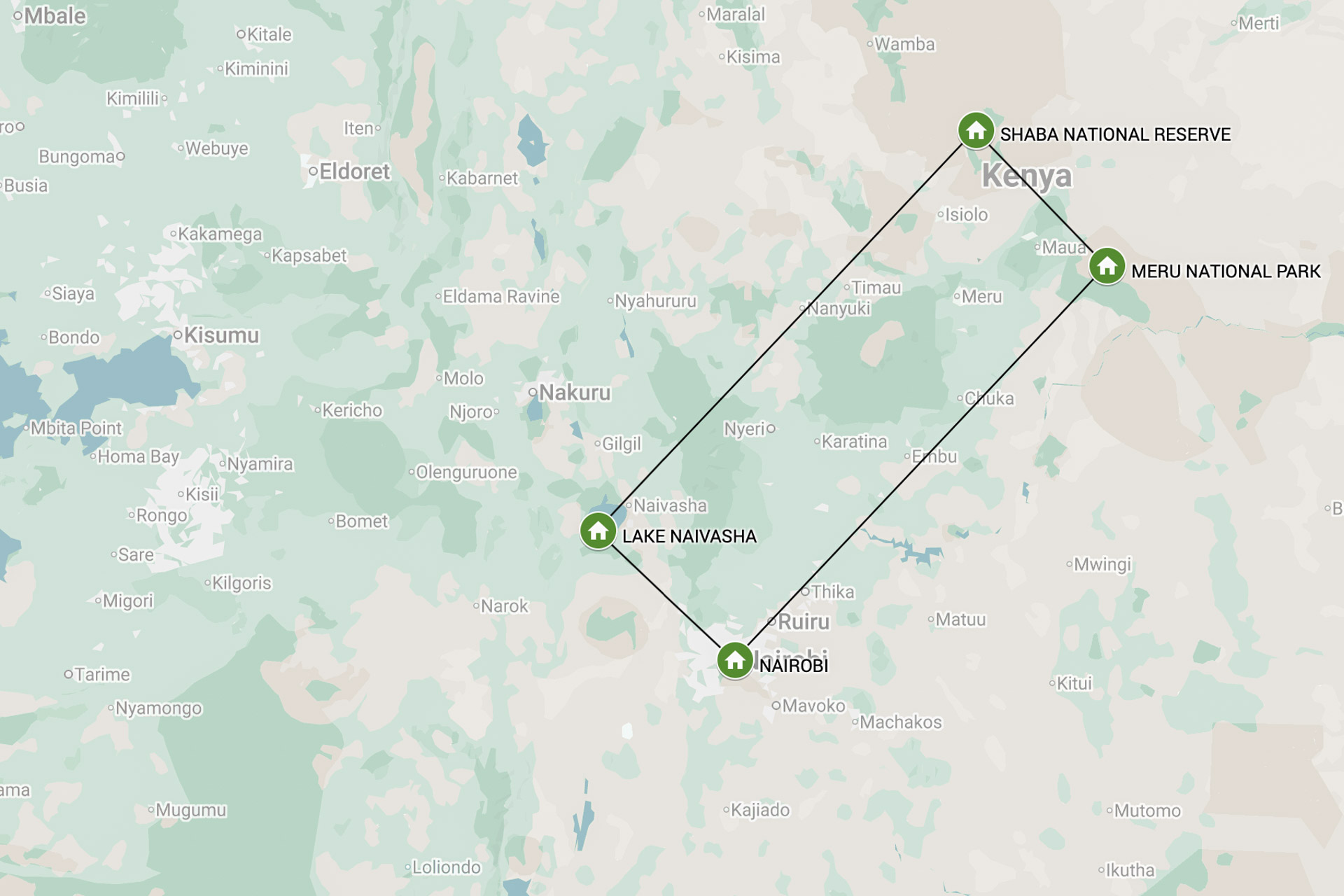 Meru National Park bjuder på en av Kenyas mest varierade vildmarker, med allt från öppna slätter och savann till skogbeklädda höjder och flodnära våtmarker. Parken är hem för ett rikt djur- och fågelliv, med elefanter, lejon, geparder, giraffer och flera ovanliga arter som Grevyzebra och nätgiraff. Meru är också en plats för kulturupplevelser, där du kan lära dig om lokal historia och se forntida fynd vid Lewa Downs.