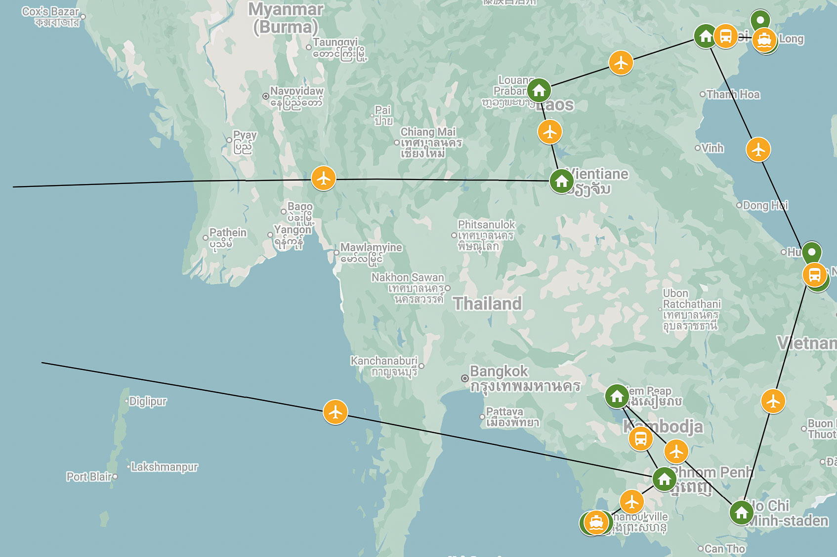 - Flyg Vientiane – Luang Prabang – Hanoi – Da Nang – Ho Chi Minh City – Siem Reap och Phnom Penh – Sihanoukville i ekonomiklass.